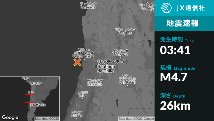8月15日 03:41頃、チリのValparaísoから西39kmの地点でM4.7の地震がありました。