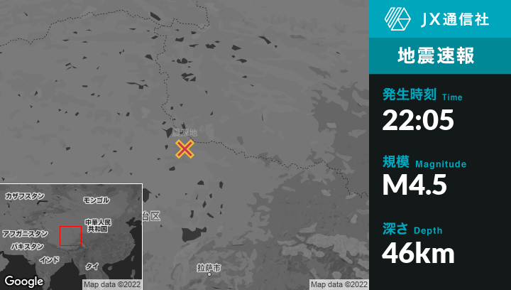 8月15日 22:05頃、中国のNagquから北西238kmの地点でM4.5の地震がありました。