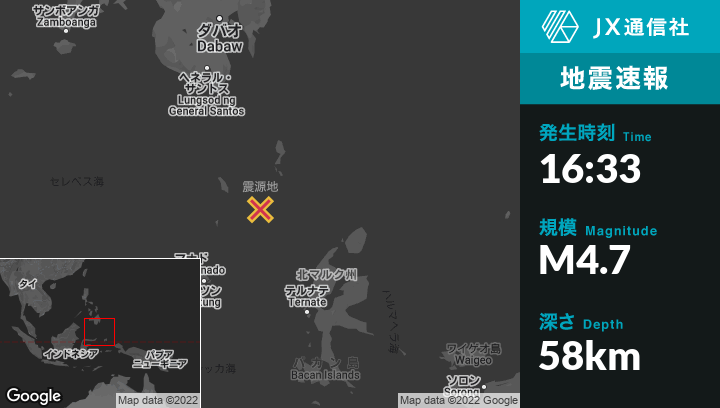 8月21日 16:33頃、ライキット II (ディメンベ)、インドネシアのLaikitから北東237kmの地点でM4.7の地震がありました。