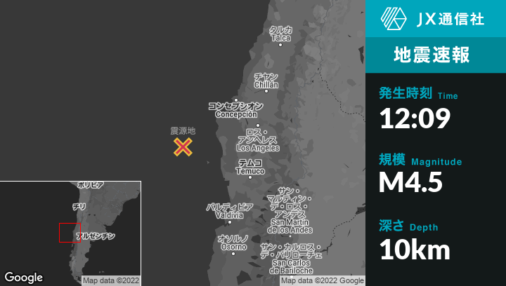 8月23日 12:09頃、チリのLebuから西南西98kmの地点でM4.5の地震がありました。