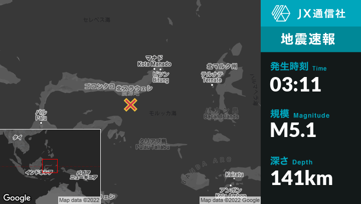 9月08日 03:11頃、インドネシアのGorontaloから南東100kmの地点でM5.1の地震がありました。