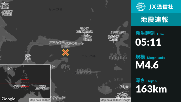 9月08日 05:11頃、インドネシアのGorontaloから南南東64kmの地点でM4.6の地震がありました。