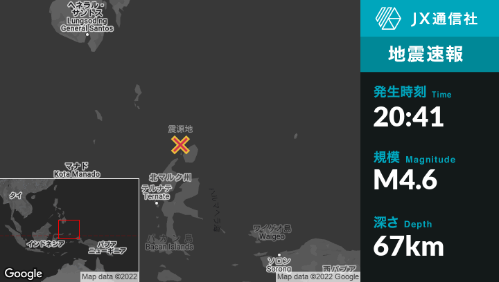 | 震源地 | インドネシアのTobeloから北113kmの地点 |
