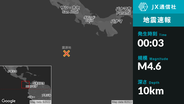 | 震源地 | パナマのBuricaから南西291kmの地点 |