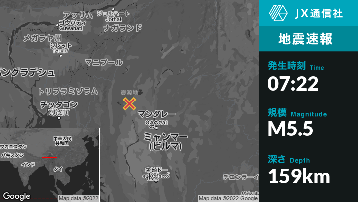 | 震源地 | ミャンマーのMawlaikから南東83kmの地点 |