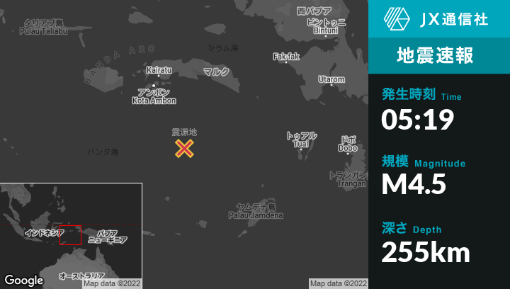 | 震源地 | インドネシアのAmbonから南南東221kmの地点 |
