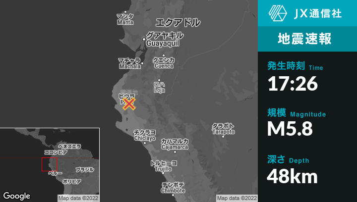 10月05日 17:26頃、ペルーのHuangalaから南南東8kmの地点でM5.8の地震がありました。