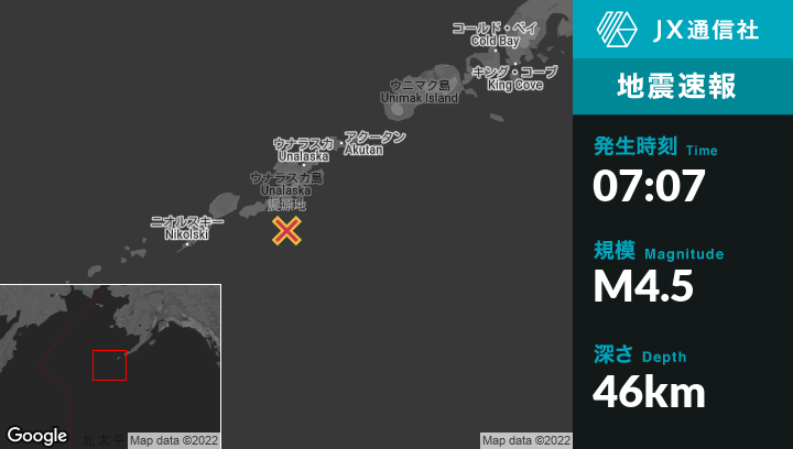 | 震源地 | アラスカのUnalaskaから南南西81kmの地点 |