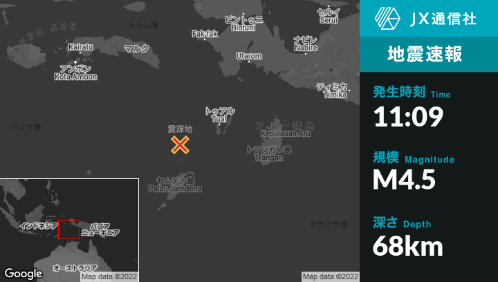 | 震源地 | インドネシアのTualから西南西149kmの地点 |