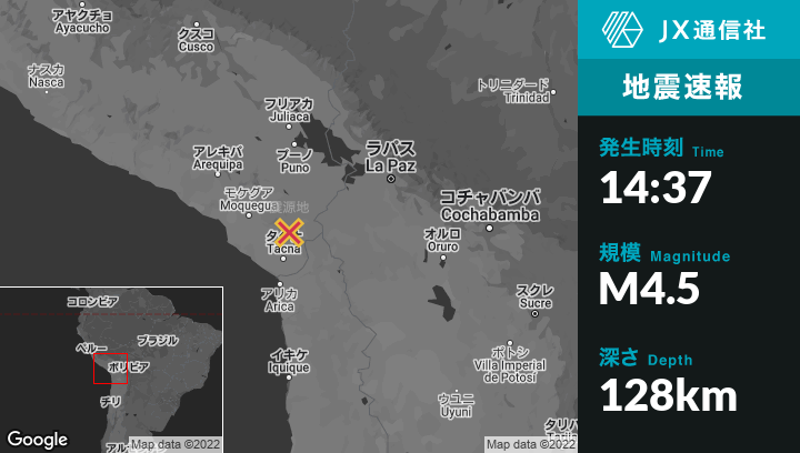 10月15日 14:37頃、ペルーのSitajaraから南西1kmの地点でM4.5の地震がありました。