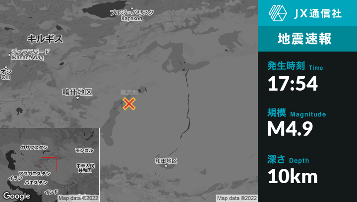 10月16日 17:54頃、中国のShacheから北東138kmの地点でM4.9の地震がありました。