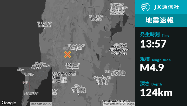10月18日 13:57頃、アルゼンチンのCalingastaから南南東42kmの地点でM4.9の地震がありました。