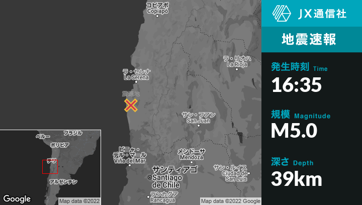 | 震源地 | チリのOvalleから西南西29kmの地点 |