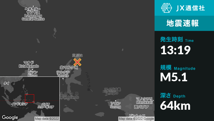 | 震源地 | インドネシアのTobeloから北東64kmの地点 |