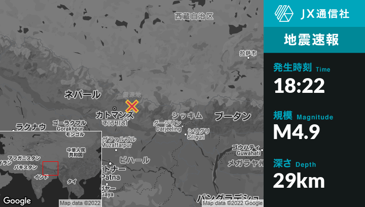 10月19日 18:22頃、ネパールのKodāri̇̄から東南東12kmの地点でM4.9の地震がありました。