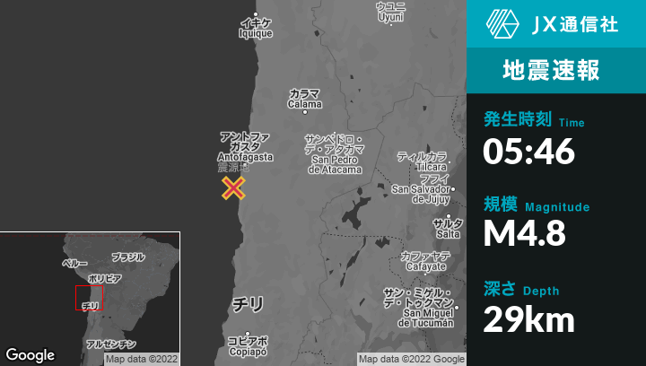 | 震源地 | チリのAntofagastaから南西52kmの地点 |