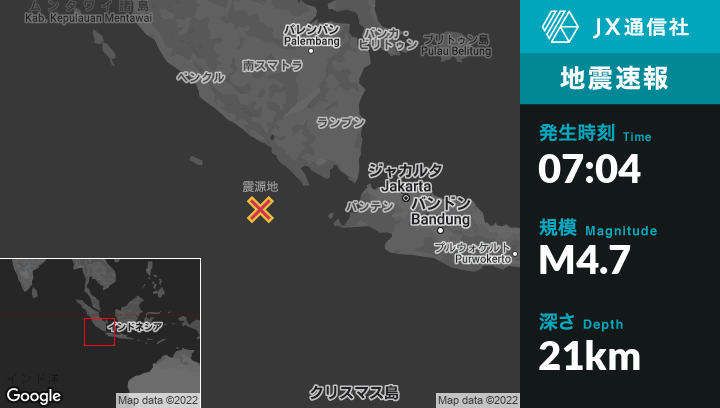 | 震源地 | インドネシアのBandar Lampungから西南西205kmの地点 |