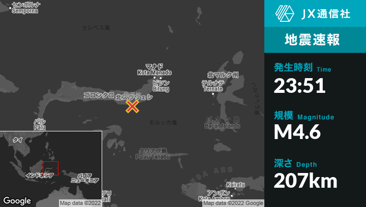 | 震源地 | インドネシアのGorontaloから東南東93kmの地点 |