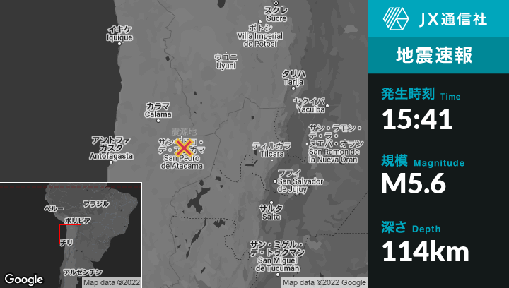 | 震源地 | チリのSan Pedro de Atacamaから南南東23kmの地点 |