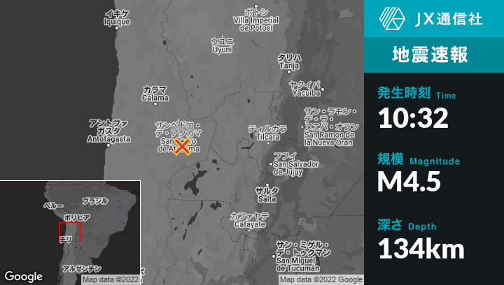 | 震源地 | チリのSan Pedro de Atacamaから南72kmの地点 |