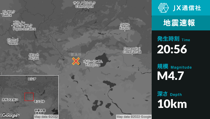 | 震源地 | ロシアのMugur-Aksyから東23kmの地点 |