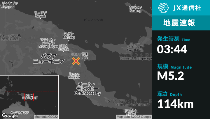 12月16日 03:44頃、パプアニューギニアのKainantuから南東63kmの地点でM5.2の地震がありました。