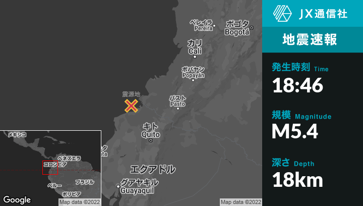 12月17日 18:46頃、エクアドルのValdezから西北西43kmの地点でM5.4の地震がありました。