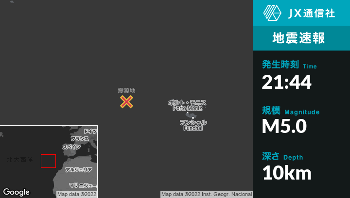 12月17日 21:44頃、ポルトガルのFajã da Ovelhaから西北西259kmの地点でM5.0の地震がありました。