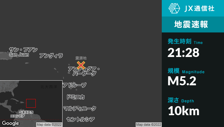 12月20日 21:28頃、アンティグア・バーブーダのCodringtonから東93kmの地点でM5.2の地震がありました。