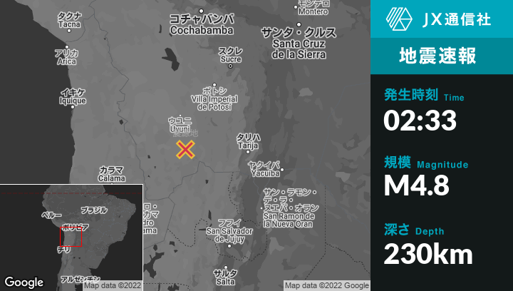 12月22日 02:33頃、ボリビアのAtochaから南西63kmの地点でM4.8の地震がありました。
