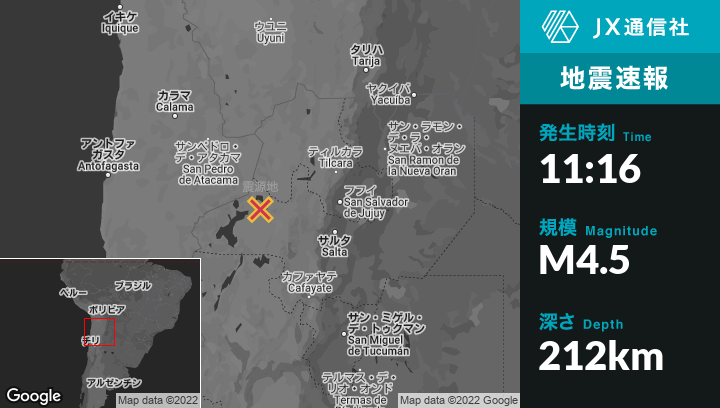 | 震源地 | アルゼンチンのSan Antonio de los Cobresから西75kmの地点 |