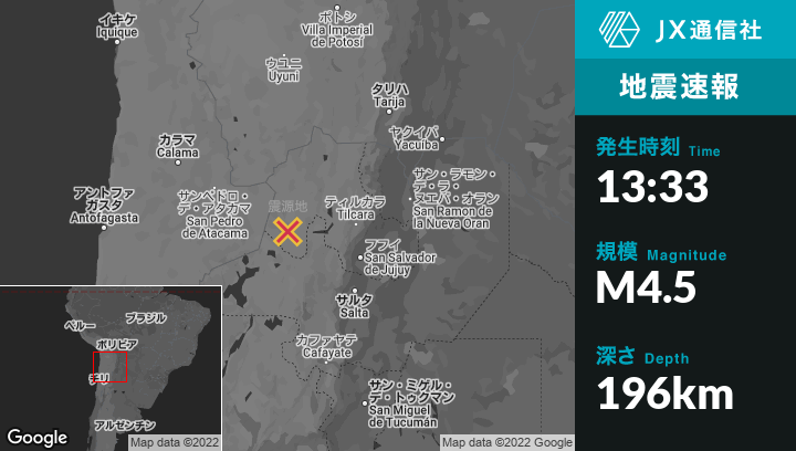 | 震源地 | アルゼンチンのSan Antonio de los Cobresから北北西81kmの地点 |