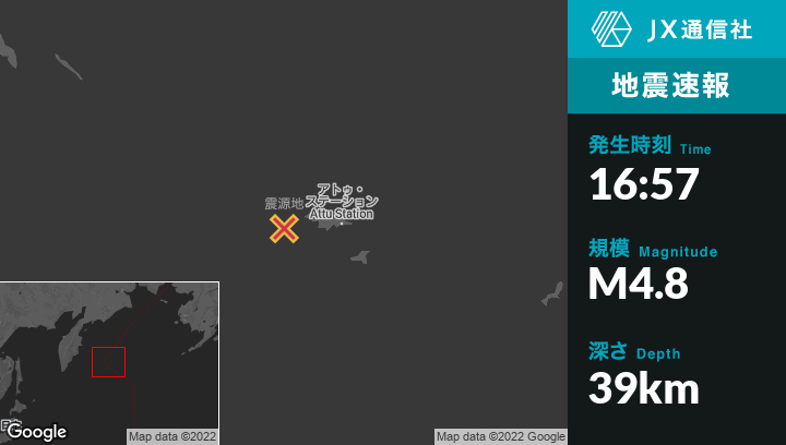 12月25日 16:57頃、アラスカのAttu Stationから西76kmの地点でM4.8の地震がありました。