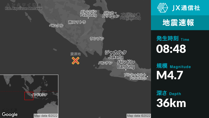 | 震源地 | インドネシアのBandar Lampungから西南西177kmの地点 |