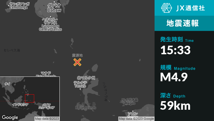 | 震源地 | インドネシアのTobeloから北西158kmの地点 |