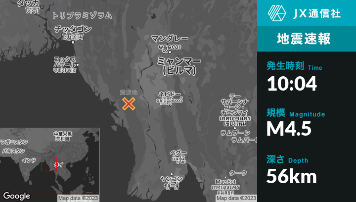 | 震源地 | ミャンマーのMinbuから西南西69kmの地点 |