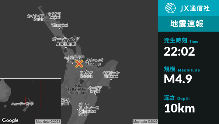 2月02日 22:02頃、ニュージーランドのMatamataから北北西14kmの地点でM4.9の地震がありました。