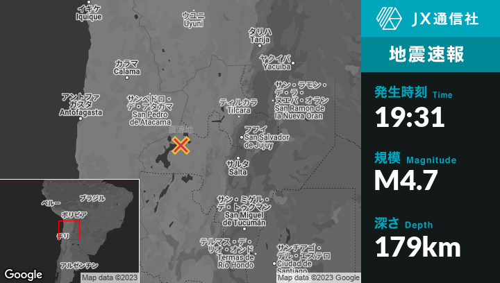 | 震源地 | アルゼンチンのSan Antonio de los Cobresから西93kmの地点 |