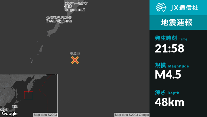 | 震源地 | ロシアのSevero-Kuril’skから南南東211kmの地点 |
