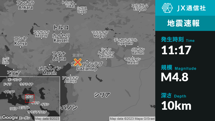 2月06日 11:17頃、トルコのNurdağıから南南西10kmの地点でM4.8の地震がありました。