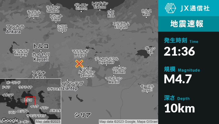 2月06日 21:36頃、トルコのÇelikhanから北8kmの地点でM4.7の地震がありました。