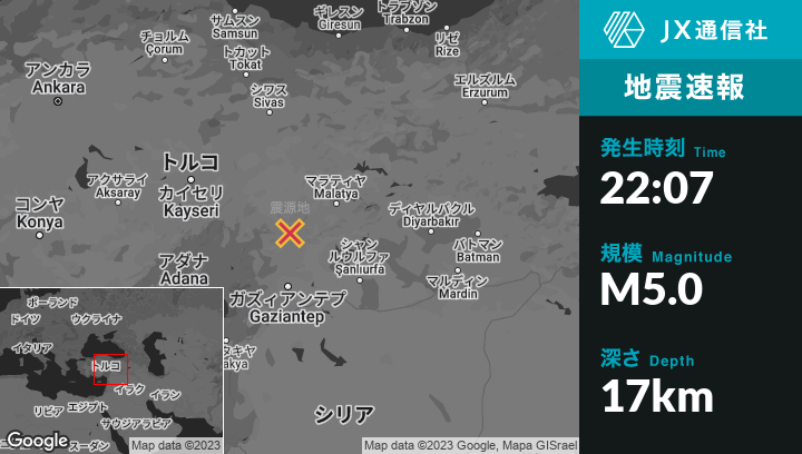 2月06日 22:07頃、トルコのNurhakから北北西3kmの地点でM5.0の地震がありました。