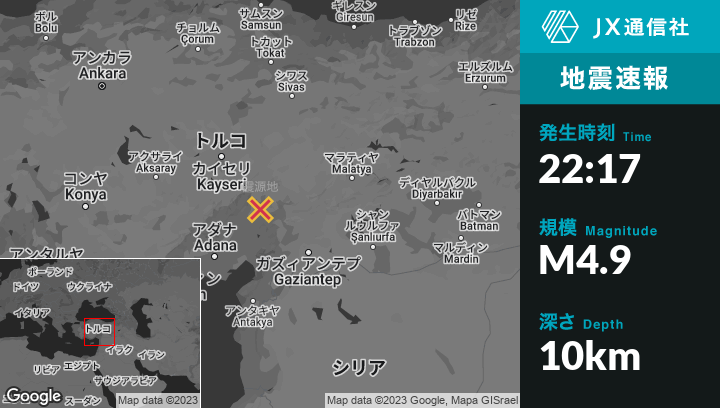 2月06日 22:17頃、トルコのGöksunから南西20kmの地点でM4.9の地震がありました。
