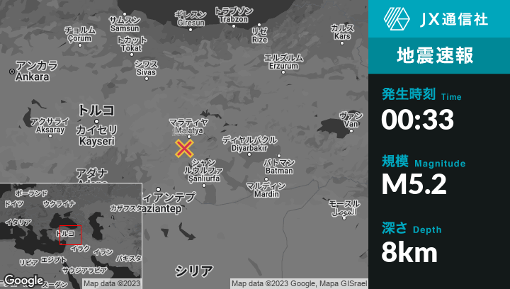 2月07日 00:33頃、トルコのÇelikhanから北北西15kmの地点でM5.2の地震がありました。