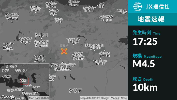 2月07日 17:25頃、トルコのNurhakから東南東4kmの地点でM4.5の地震がありました。
