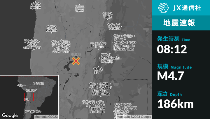 | 震源地 | アルゼンチンのSan Antonio de los Cobresから西81kmの地点 |