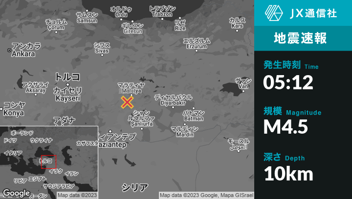 2月09日 05:12頃、トルコのYeşilyurtから南西13kmの地点でM4.5の地震がありました。
