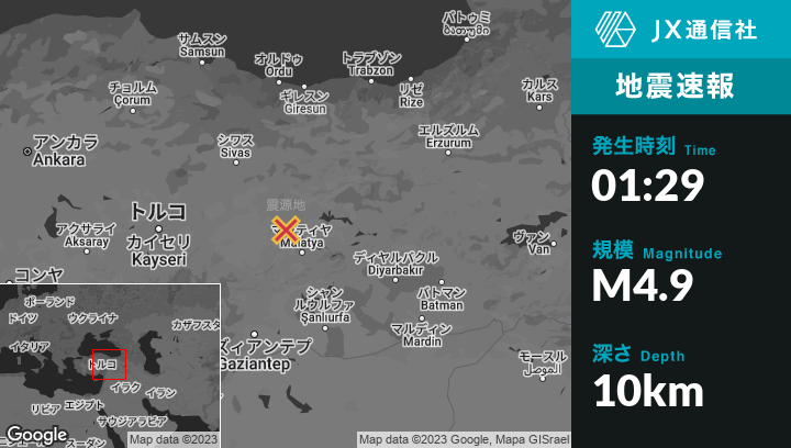 2月13日 01:29頃、トルコのHekimhanから東7kmの地点でM4.9の地震がありました。