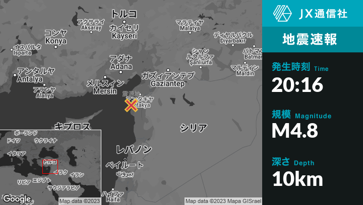 2月16日 20:16頃、トルコのYayladağıから西26kmの地点でM4.8の地震がありました。