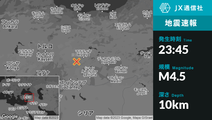 2月16日 23:45頃、トルコのDoğanşehirから北北西14kmの地点でM4.5の地震がありました。
